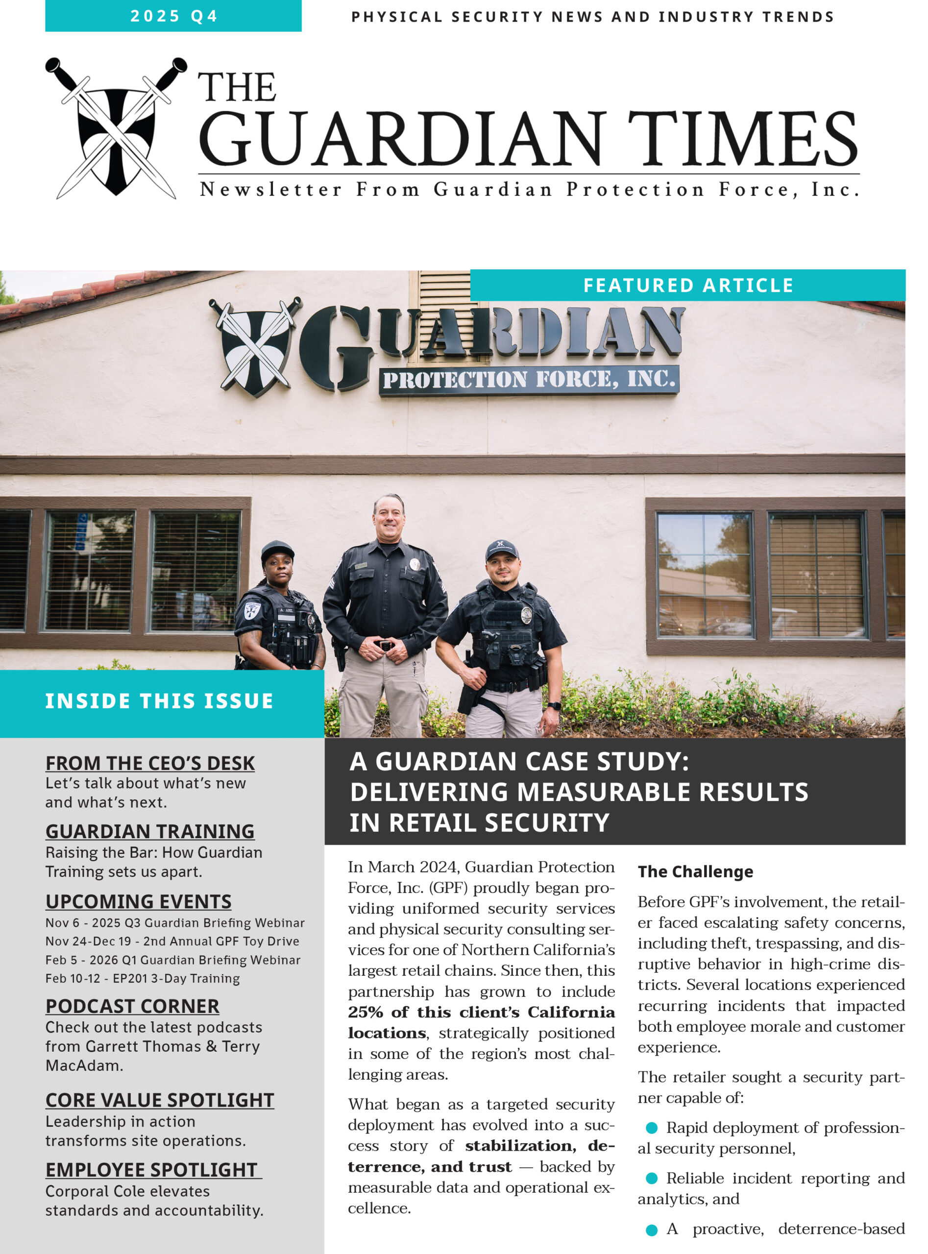 The Guardian Times is your free quarterly briefing on what’s happening now in physical security – from executive protection and surveillance to workplace violence prevention, preparedness, and industry legislation. Each issue blends real-world field insight with leadership perspective and practical takeaways you can put to work immediately.